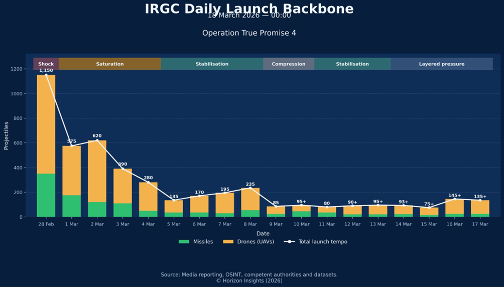 圖4:伊朗每日發射飛彈與無人機數量累計。資料來源:Ibrahim Jalal , X, Mar 18,