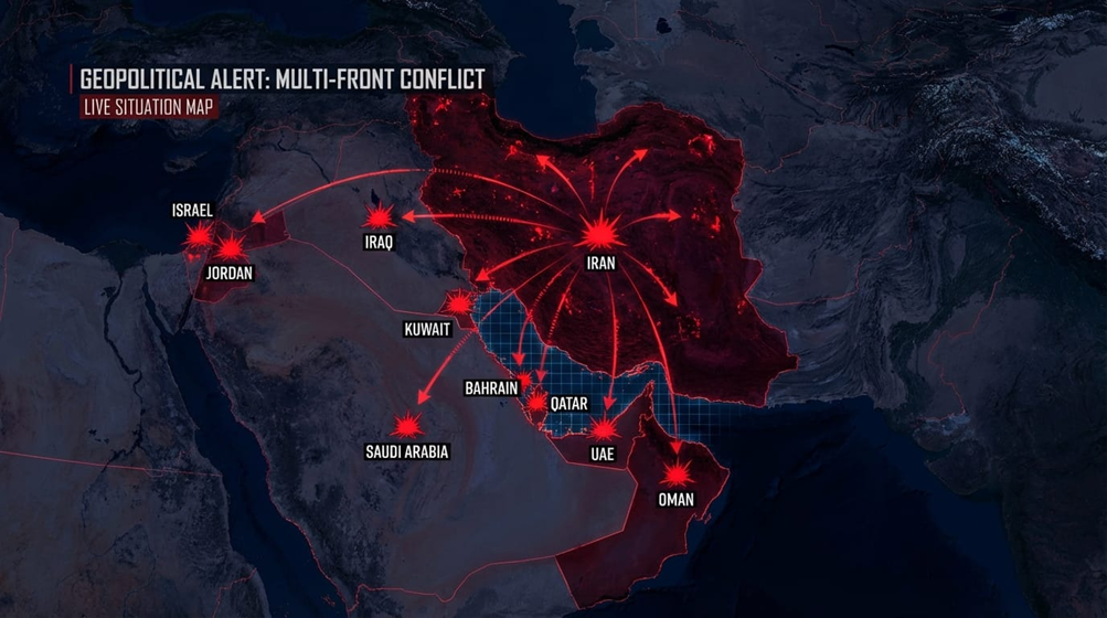 受到打擊後,神權政府第一、且唯一一波有效的反擊,即是針對周邊海灣國家的水平升級報復;「真實應許4號(True Promise 4)」行動號召伊斯蘭戰士為哈梅尼的殉道進行響應,[5]對大公國(UAE)的達夫拉空軍基地(Al-Dhafra Air Base)、謝赫扎耶德路(Sheikh Zayed Road)美軍集結點、科威特的阿曼賈比爾空軍基地(Ahmad Al-Jaber Air Base)、沙烏地阿拉的蘇丹國王空軍基地(King Sultan Base / Prince Sultan Air Base)、伊拉克的勝利基地(Victory Base)等地進行打擊,鄰國機場、港口、工業區等非軍事據點亦遭受一定程度的波及與破壞(圖3)。